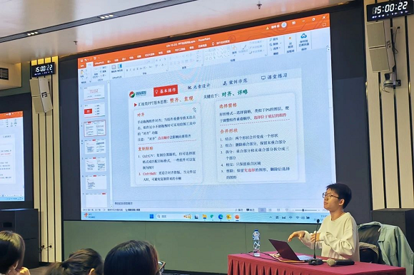 在课堂练习环节,学生们利用讲座所提供的素材,在现场指导下亲手制作学院PPT模板。在制作过程中,梁珈玮带领学生构建内容框架并理清设计思路,帮助学生们解决无从下手的开头难关。梁珈玮还展示了几种常见的错误设计,并通过对比演示,讲解了优化改进的方法,用细致入微的操作示范了如何通过精细化的设计处理,使画面内容更具条理性。梁珈玮特别指出,好的PPT设计应当注重信息和排版的层次感和逻辑性,从而更好地传达演讲者的思想。