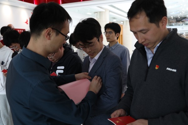 程伯儒、陈九为新发展党员佩戴党员徽章并赠予《中国共产党章程》。